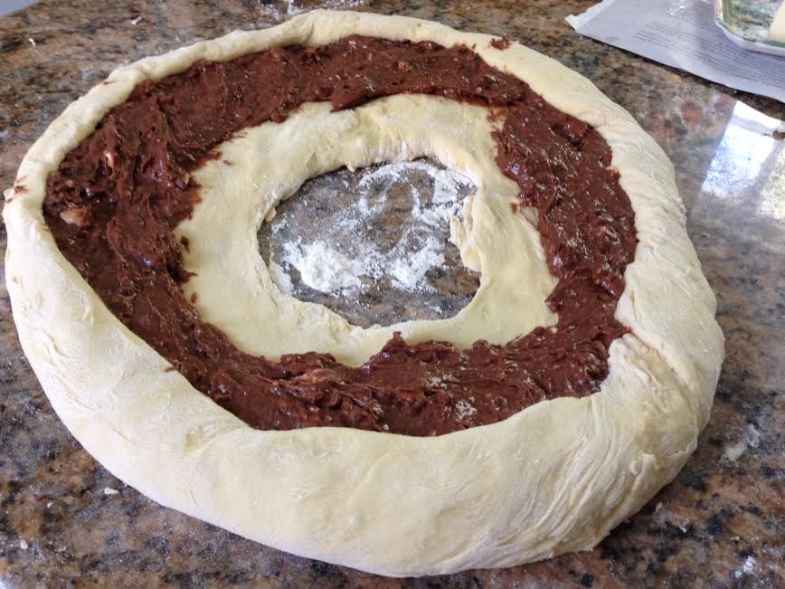 Drape outside edges over filling and continue rolling outside inward until filling is covered, widening inner hole as needed, until dough covers the seam.