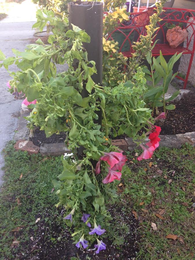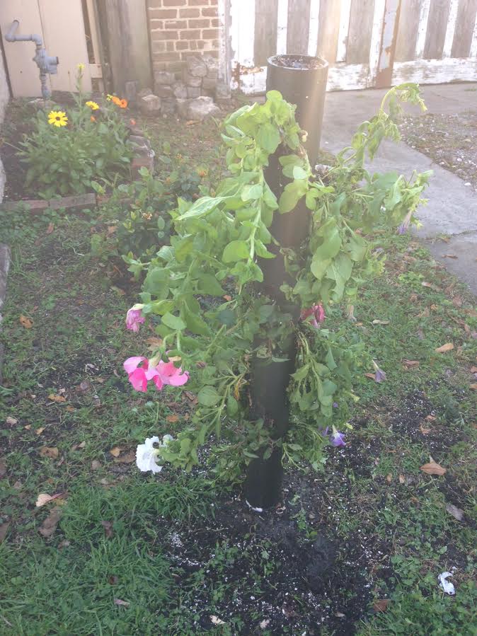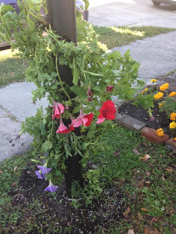 And a new flower post fashioned from a PVC pipe, hole punched and spray-painted and stacked with petunias and other bloomers. Pretty sure this is un-waterable…. didn’t think about that in the envisioning stage. Soon there will be a mailbox attached to the top in which I will place Various Letters to the World. I am hoping that the postman won’t confuse it with my actual mailbox, because I want my neighbors to check it as they walk their dogs or push their strollers or head out for dinner at our local pubs and diners—it will be like a Midcity fortune cookie with wisdom, jokes, sweet nothings and quotations. Or a repository for trash. Stay tuned.