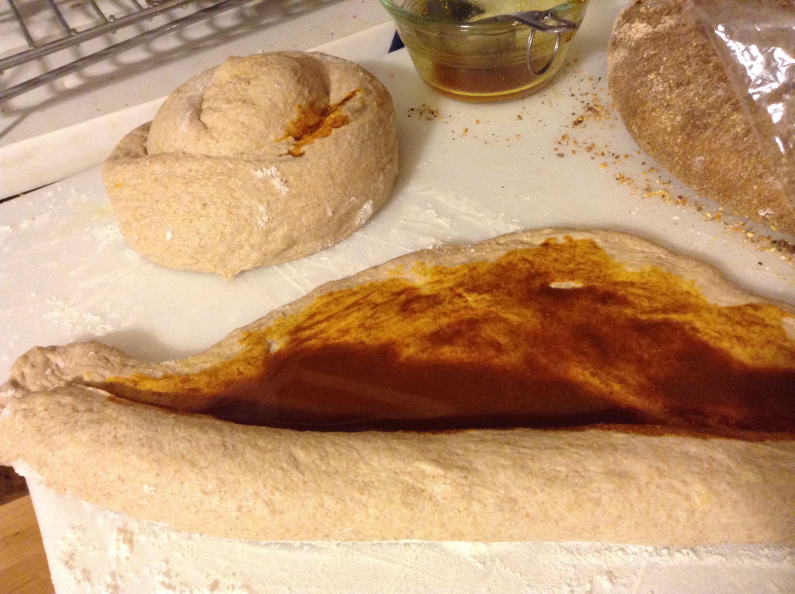 Divide dough in two and always keep remaining pieces covered with plastic wrap, flatten 1 piece of dough into a disk. Roll out disk as thinly as possible (into a 9-inch round) on a lightly floured surface with a 6-inch wooden dowel or a rolling pin. Spread 1 teaspoon spiced oil on dough with your fingertips, then roll up tightly into a long cylinder and coil into a tight spiral. Transfer to a large sheet of parchment paper, then loosely cover with plastic wrap.
