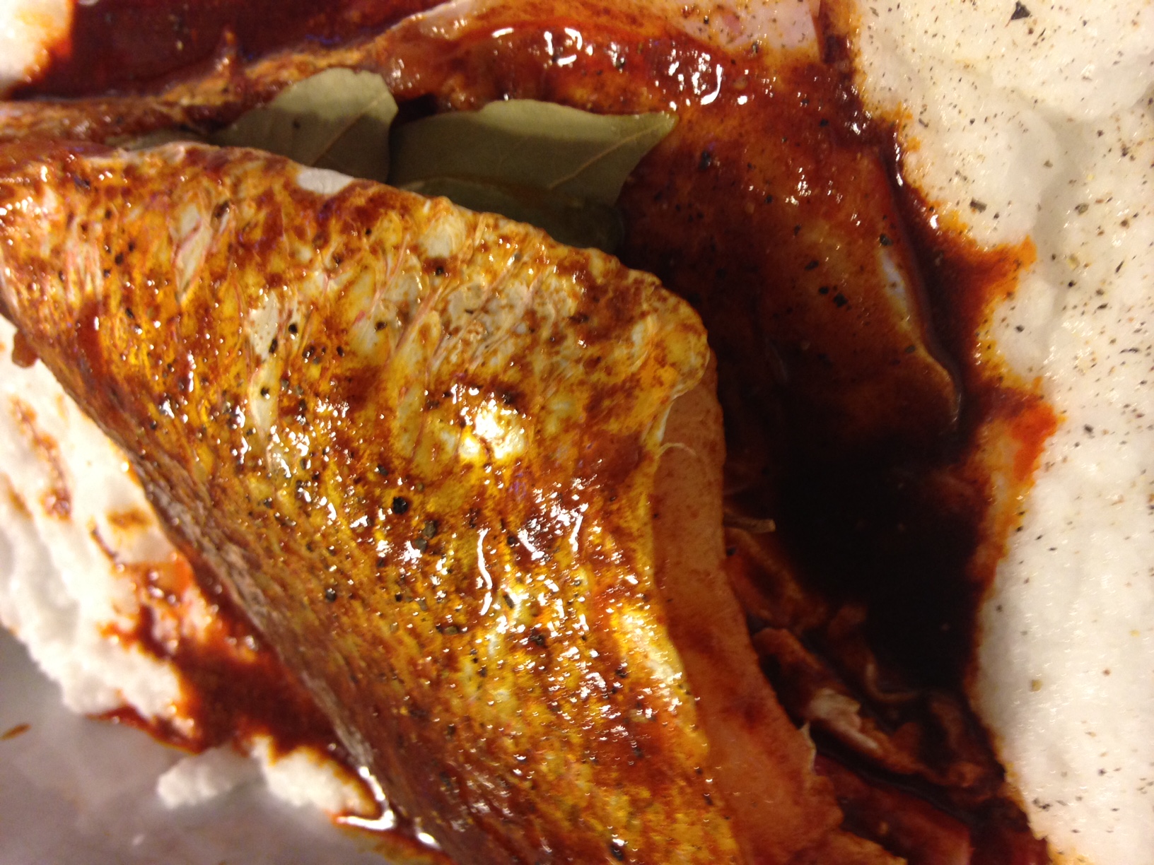 - Spread a 1/4-inch-thick layer of the salt mixture in the center of a large rimmed baking sheet. Season the fish inside and out with black pepper and brush all over with the pimentón oil. Stuff the cavity with the lemon slices and bay leaves and lay the snapper on the salt. Mound the remaining salt mixture on top, lightly packing it to completely cover the fish.