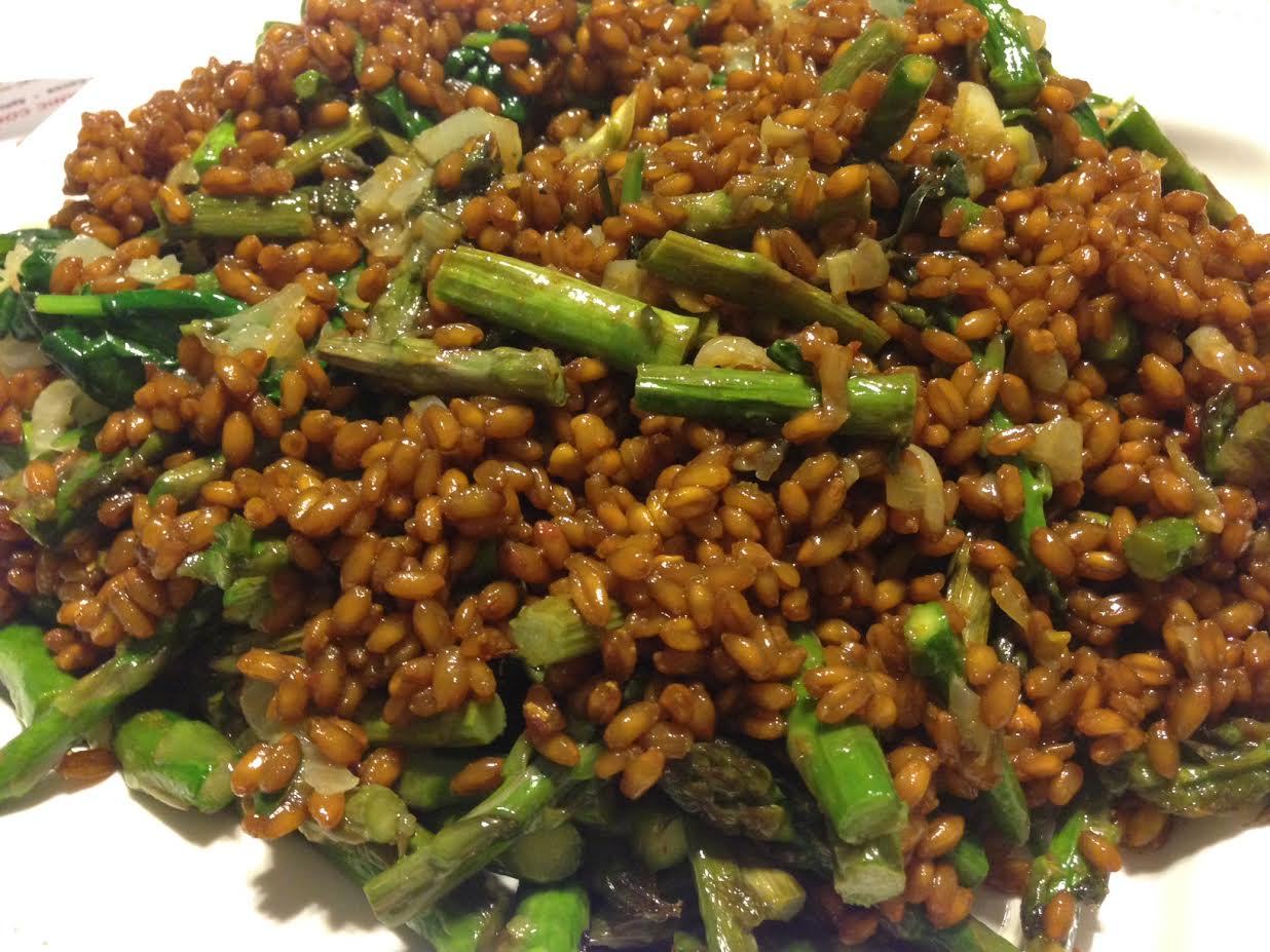 For the veggie, cook down the onions and greens with olive oil in a skillet until greens are wilted and the onions are browned. Set aside to cool, and then also roast the asparagus in more olive oil. Combine the veggies with 2 more tbs of the dressing, and then put on a plate, topped with the wheat berries, or else, cover and transfer to a cool place to serve later. Serve with extra salad dressing if you have a craving for more flavor.