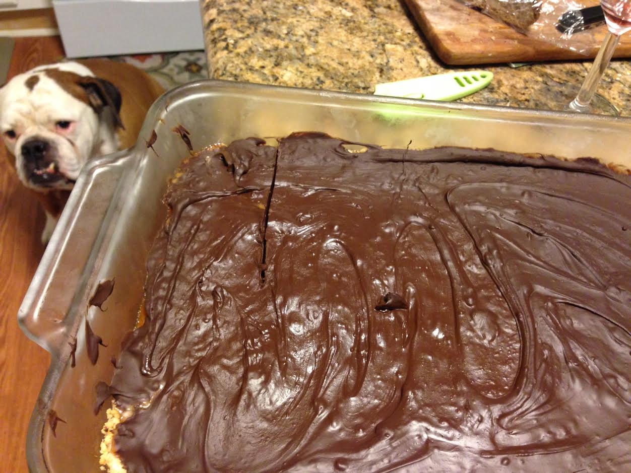 For the chocolate, melt the chocolate and butter using a double boiler or in a glass bowl placed over a pot of boiling water. Stir until melted. Pour and spread the chocolate over the cooled caramel. Sprinkle with the salt. Refrigerate until the chocolate has set, about 2 hours. Cut and serve or refrigerate the cut pieces in a cookie tin.