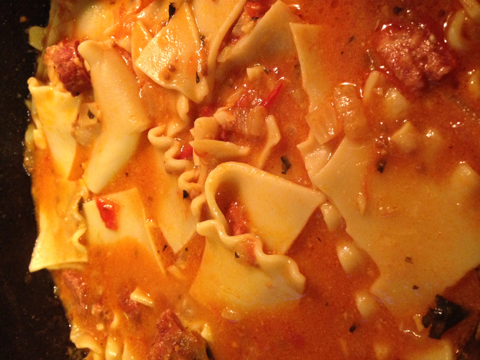 So, I found this dish an unappetizing concept until I made it, but it is De-Licious. A hearty fall soup with Italian zing. Something about wrinkly noodles in dark broth evokes the primordial…but lasagna in casserole is not particularly fetching at baseline either. Taste knows no shape.