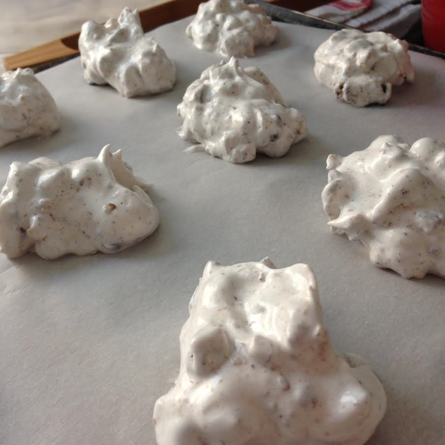 Using 2 spoons, drop 2-inch balls of the meringue mixture onto a large foil-lined baking sheet. Sprinkle the cookies with sea salt and bake for 5 minutes. Turn the oven off and leave the cookies in for at least 8 hours or overnight before serving.