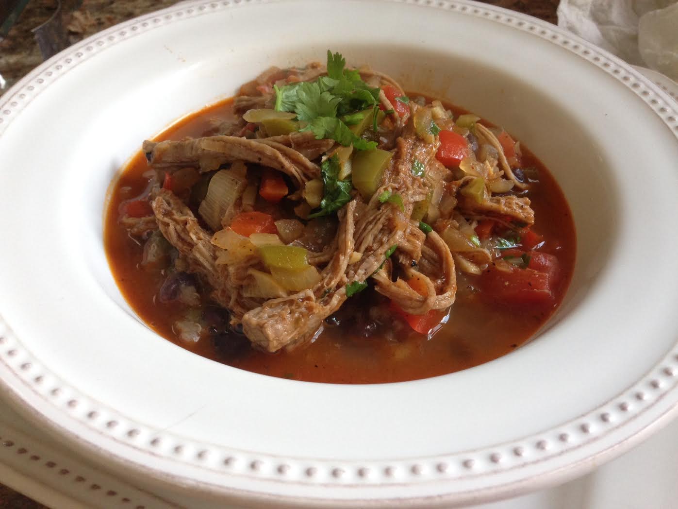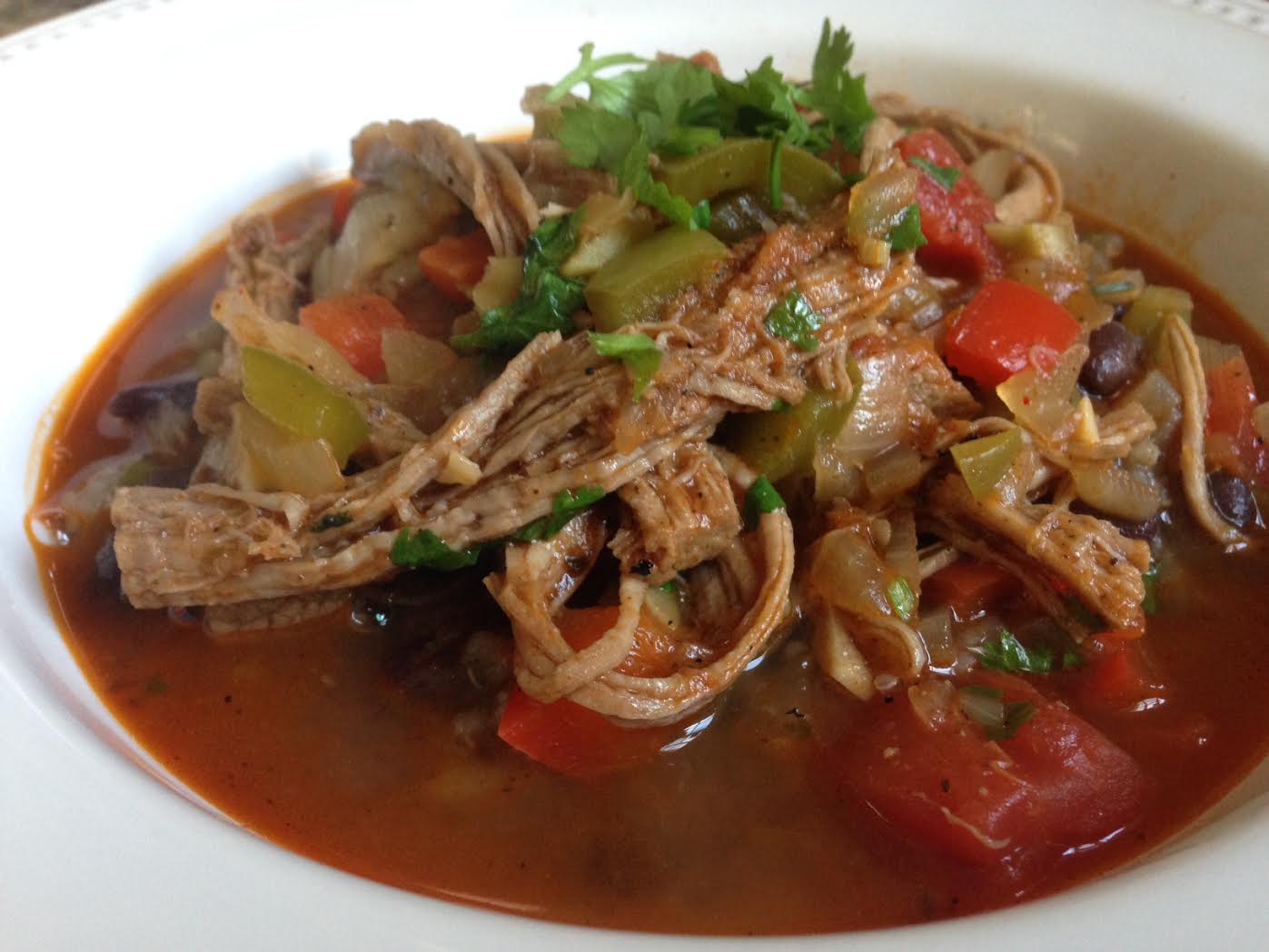 Heat a large saute pan and heat oil. Add red pepper, green pepper, onion and garlic and saute for 1 minute on high heat. Reduce heat to medium-low, add cumin, smoked paprika, oregano, salt, pepper, and tomato paste. Saute for 3 minutes until flavors “marry.” Add diced tomatoes, olives, reserved stock, and bay leaves and simmer for 10 minutes. Then add the shredded steak and simmer for another 10 minutes. Fold in chopped cilantro and serve.