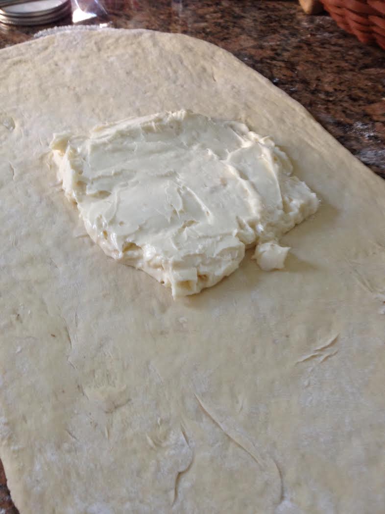 On a lightly floured surface, roll out the dough to a 10-by-16-inch rectangle. Set the butter square in the center of the dough.