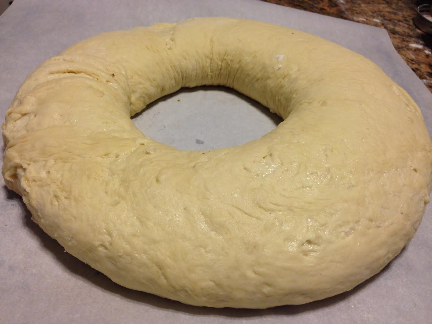 Slide the dough onto a large sheet of parchment paper and roll it over so it’s seam side down. Shape the dough into a ring: Moisten the inside of one end with water and place the other end inside, pinching to seal. Slide the parchment and kringle onto a rimmed baking sheet. Refrigerate until chilled, 30 minutes.