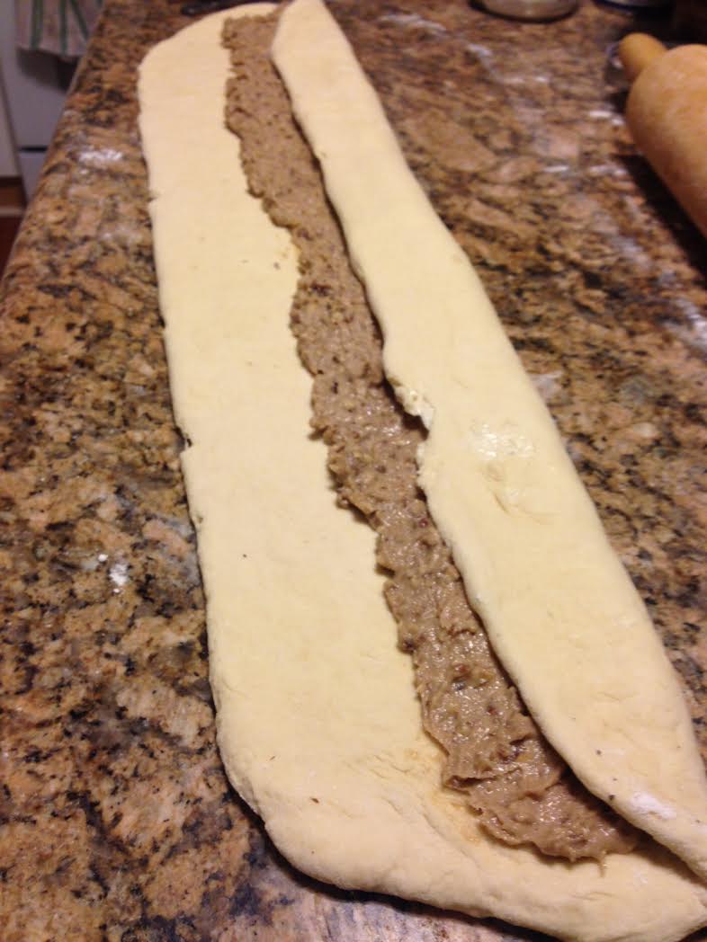 On a lightly floured surface, roll out the dough to a 30-by-8-inch rectangle. Spread the filling down the length of the rectangle, leaving a 2-inch border of dough on each side. Fold one long side over the filling, then fold the other long side on top, overlapping by 1/2 inch; pinch to seal.