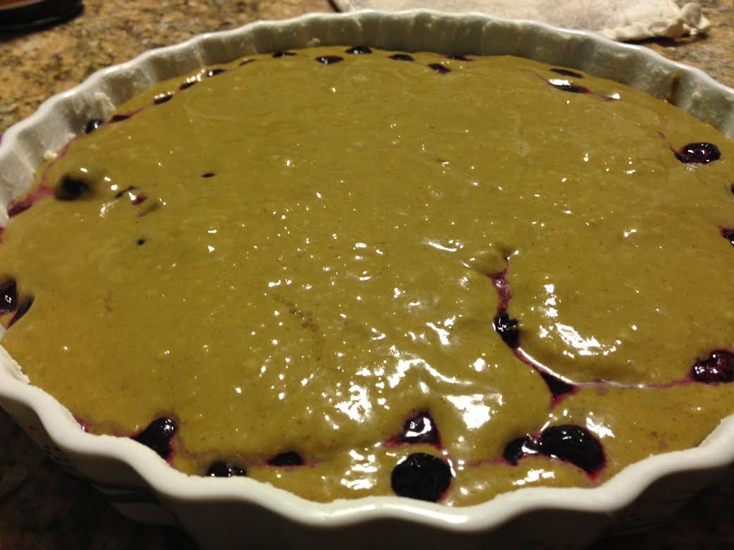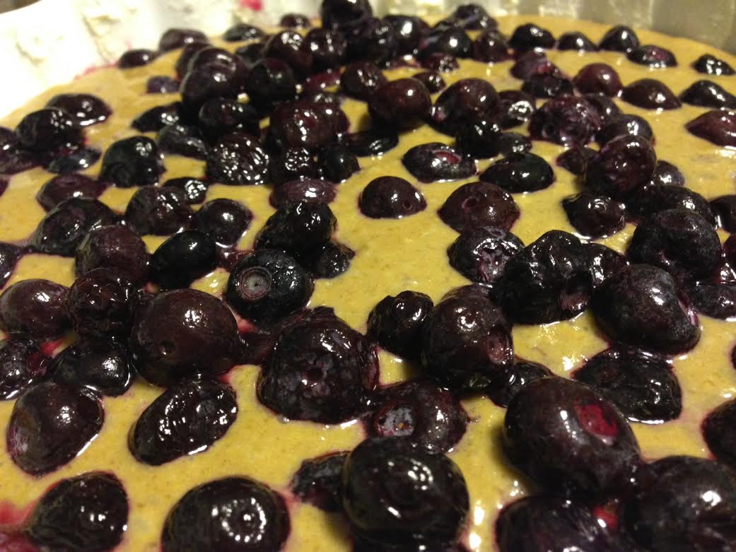 Preheat oven to 350°. Grease and flour a 1 1/2-quart baking dish and set aside. Drain the berries well, reserving the juice. Set the berries aside. In a large bowl, combine the reserved juice and the sour cream. In a second bowl, combine the flour, brown sugar, baking soda, ginger, salt, mace, and cinnamon. Mix well and set aside. Stir the eggs, molasses and melted butter into the sour cream mixture. Add 1/2 cup of the flour mix to the batter and beat well. Gradually add the rest of the dry ingredients to the batter and beat on high until smooth and a bit fluffy. Spread 2/3 of the batter into the pan. Arrange the berries evenly over the batter.