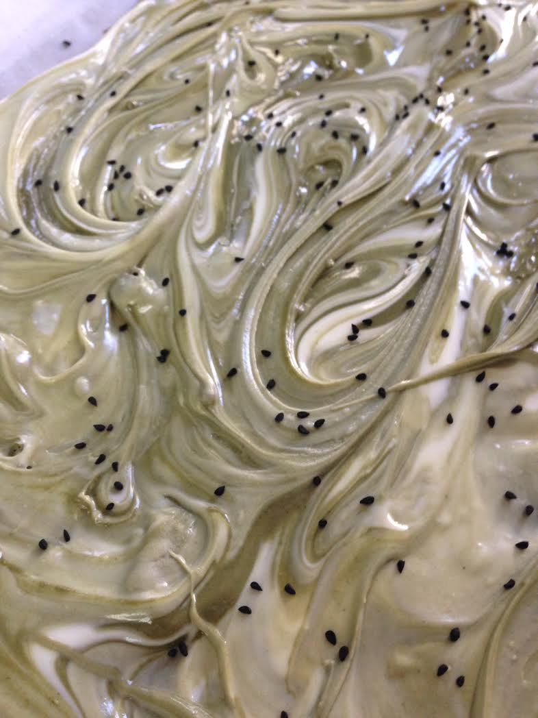 Mix 1/2 cup of the melted white chocolate with the matcha until no streaks remain. Scatter large spoonfuls of the matcha chocolate and the white chocolate over the dark chocolate layer and, working quickly, use a small spatula to decoratively swirl the matcha chocolate with the white chocolate. Sprinkle with the sesame seeds. Let stand at room temperature until firm, 2 hours. Remove the bark from the pan, cut into pieces and serve