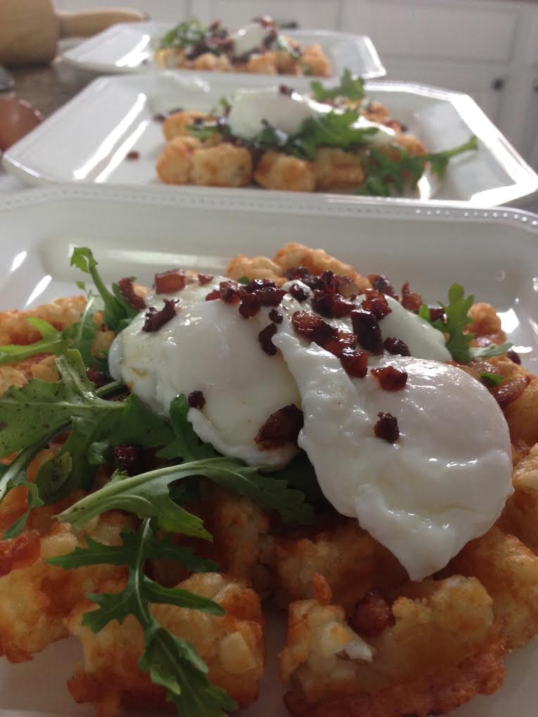 Tater Tot Waffles with Proscuitto, Mustard and Poached Eggs