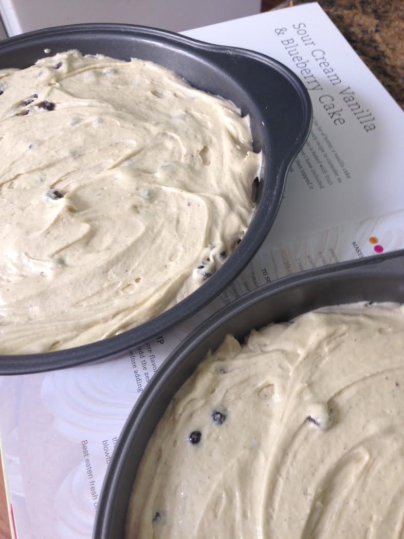 Preheat oven to 325 F. Grease and line with parchment two 8 inch round pans. Cream butter and sugar until fluffy, then add beaten eggs one at a time. Beat well. Add vanilla paste. Sift flour and baking powder together and fold that in. Stir in sour cream, then finally fold in 1 cup of the blueberries. Spoon batter evenly into each pan and then bake for 45 minutes. Let cool then chill for several hours.