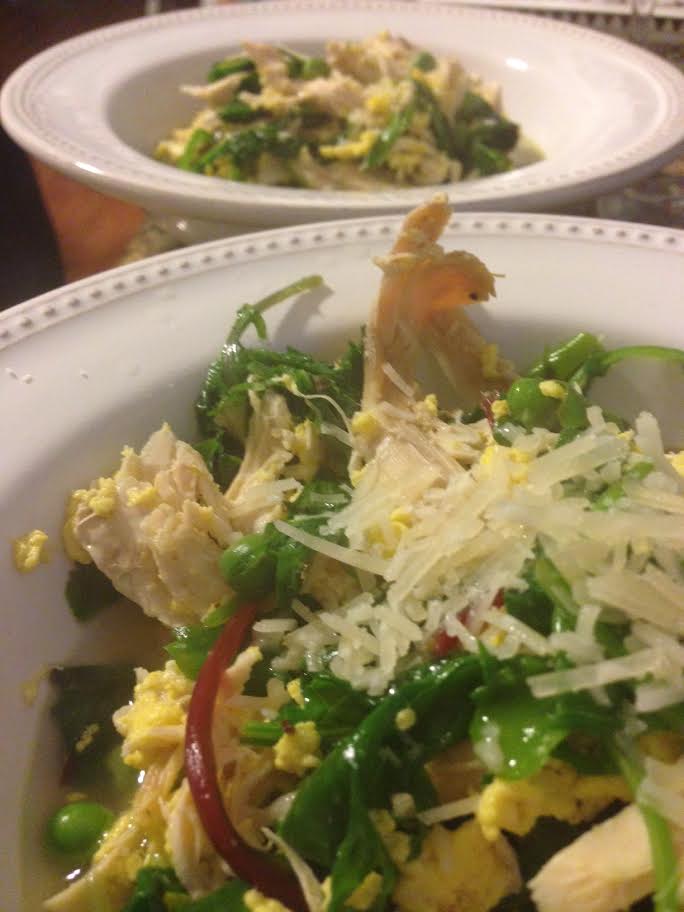 In a medium pot, bring the chicken stock to a simmer over moderate heat. In a small bowl, whisk together the eggs and cheese. Slowly add the egg mixture into the hot stock, stirring constantly, until the eggs are just set, about 1 minute. Stir in the chicken and peas and simmer until heated through, about 2 minutes. Add the spinach and basil and cook until just wilted, about 1 minute. Season with salt and pepper and serve.