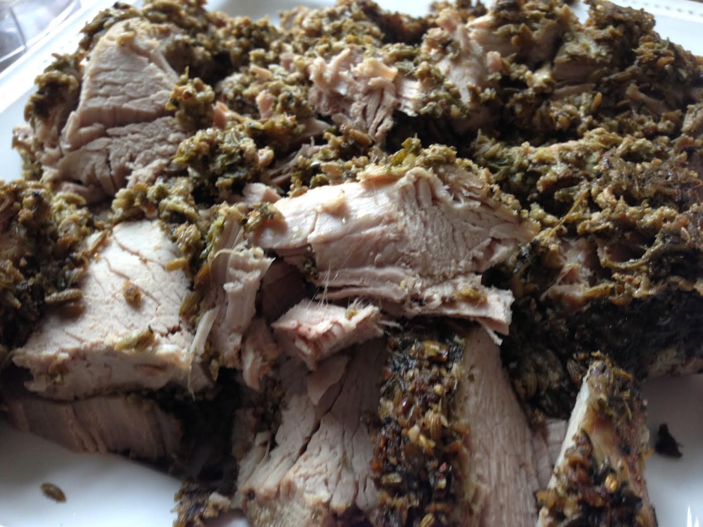 Make some slashes in your pork loin. Blend all the above ingredients in a food processor. Then rub the stuff into all the creases and wrap tightly in saran. Let marinate like that in the fridge overnight. Transfer to foil, get the grill going and cook until the internal temp registers 190 degrees F. Check it with the Eat Smart thermometer!