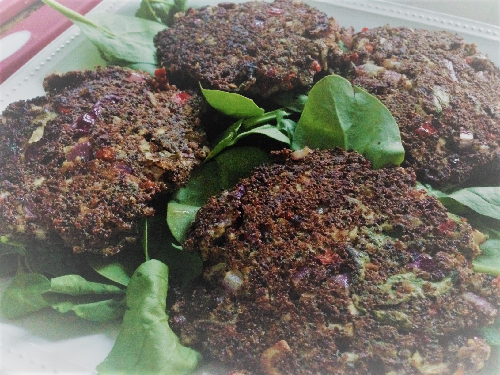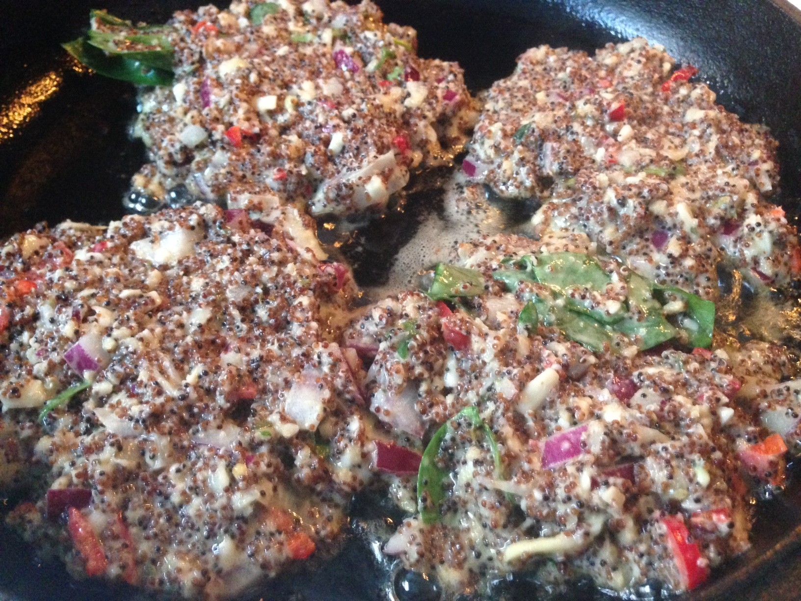 Heat 1 tablespoon oil in a large nonstick skillet over medium-high. Add patties to pan; cook 4 minutes on each side or until browned and crisp. Remove from heat. Serve over baby spinach. These are so delicious– I ate them for breakfast lunch and dinner for two days.
