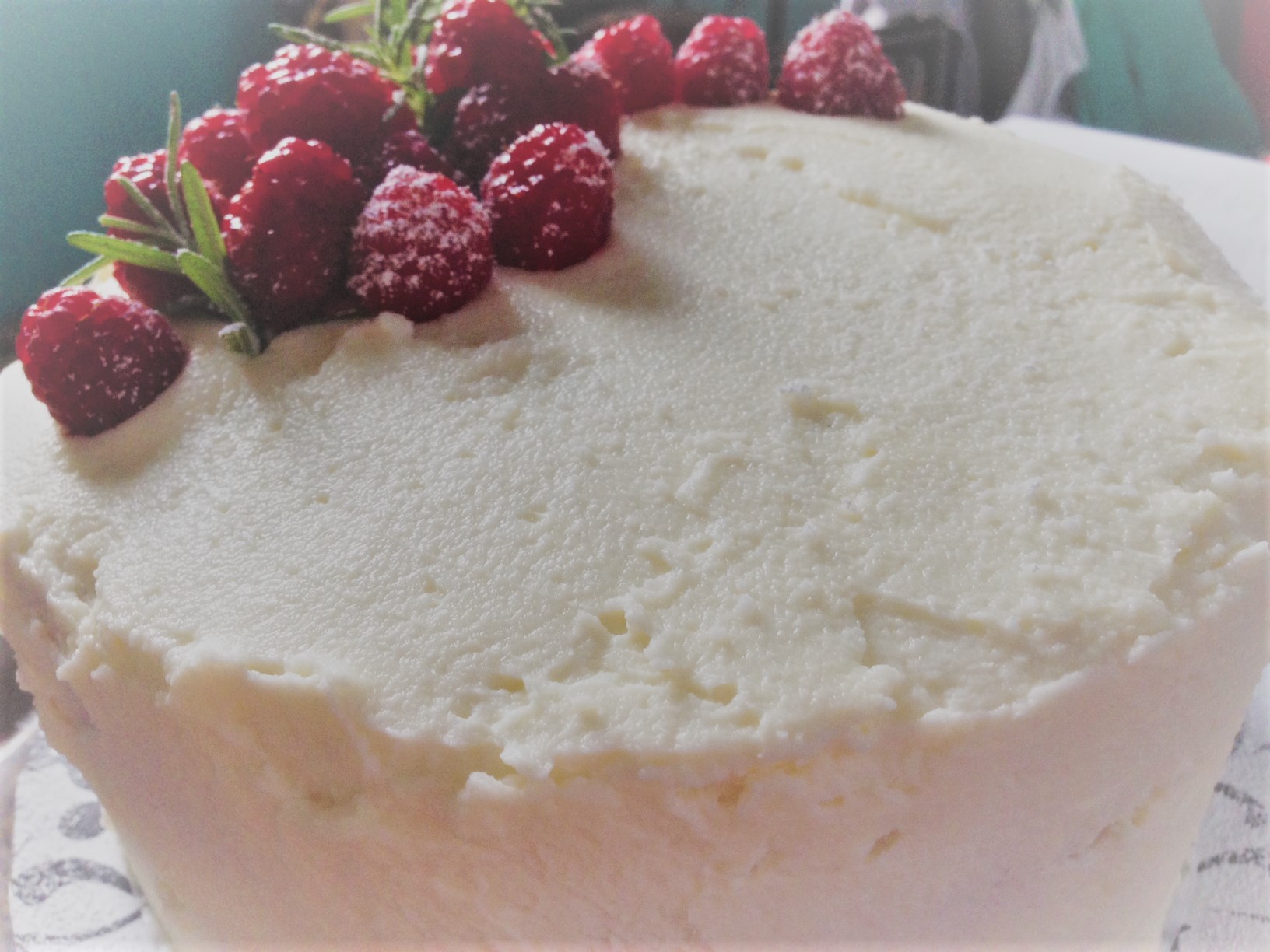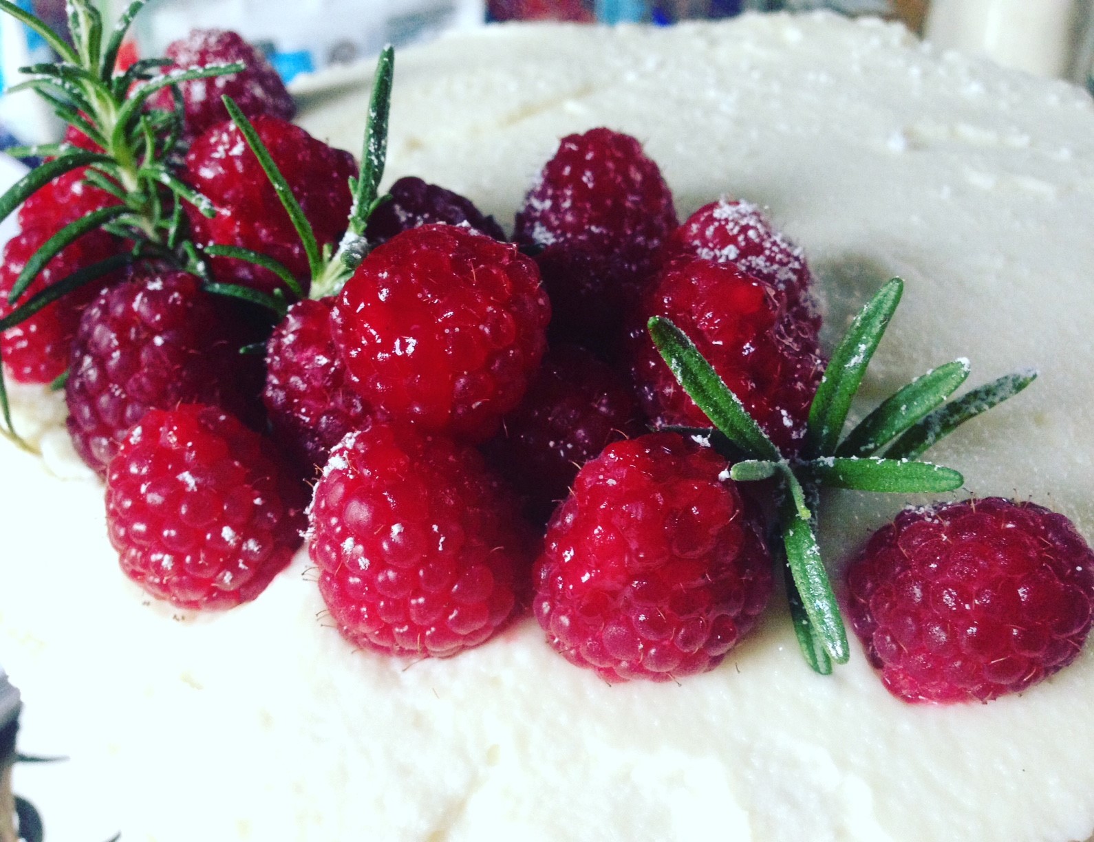 Finally, level the cakes. Brush rosemary syrup over each cake and let soak in. Pipe a ring of frosting around the middle layer to create a ridge and fill with spoonfuls of the raspberry fill. Repeat with a second layer if you are doing a triple layer cake. Then frost and top with little pretty raspberries and rosemary and sifted confectioner’s sugar. Do a couple of ballerina moves, plie, arabesque, pirouette, splits! Because that is what you have done dessert-wise.