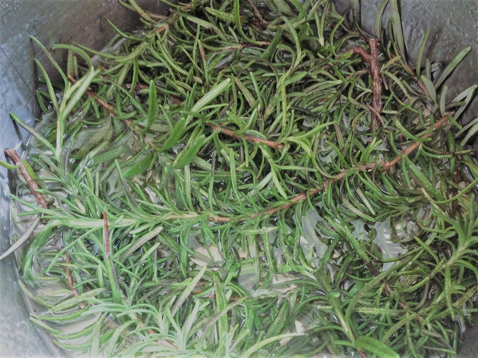 Make the syrup first. Put sugar and water in a pan and heat to a simmer for 15-20 minutes until a little syrupy. Add the rosemary (and it’s going to seem like a ton. I actually only used one ounce because I didn’t have enough on my little rosemary bush and I didn’t want to leave it denuded. I think 40 grams was plenty to confer the proper flavor). Cover and remove from heat and let cool to room temperature, then move to chill in the fridge overnight.