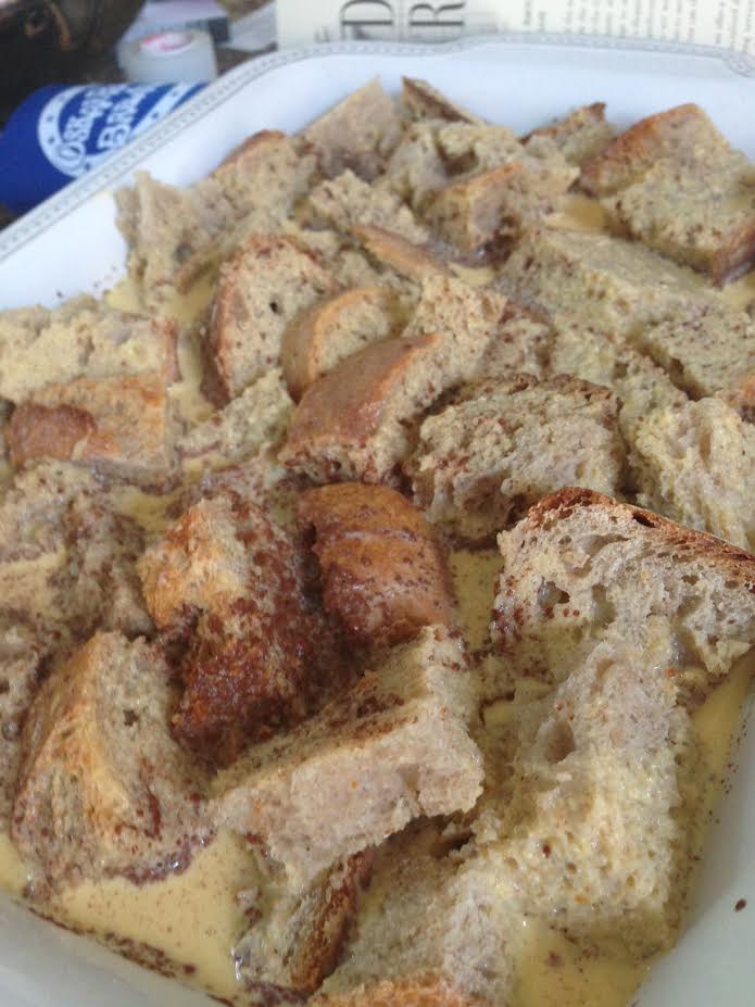 Grease a 9×13 inch pan. Layer the dried bread in the bottom of the pan. In a large bowl, whisk together the eggs, milk, half & half, sugar, vanilla, cinnamon, and nutmeg. Mix well. Pour over the bread. Pat plastic wrap over the bread and refrigerate for at least 8 hours. Make sure the bread is sitting fully in the liquid; place a plate on top of the plastic wrap to keep the bread submerged if necessary.