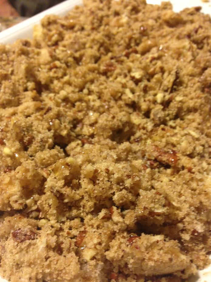 Preheat oven to 350°. Place a piece of foil on the rack to catch any drips. Remove the French toast from the refrigerator. In a medium bowl, combine the butter, syrup, brown sugar and pecans. Mix until crumbly. Spoon the topping evenly over the French toast. Bake at 350° for about 1 hour, or until puffed and golden. Cool for 10 minutes before serving.