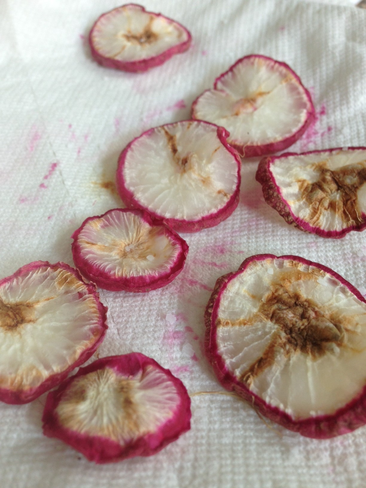 My existence pivots on the bold discovery I made today—finally, with enthusiasm, I am a woman who eats beets and radishes. In this week’s CSA, I received yet another mother load of Hakueri Turnips and Pink Beauty Radishes, which, in past months I’ve chosen to hawk on fellow beet-lovers (rare friends in New Orleans, okay, just one), but now, I turn these root veggies into beet chips and gobble them up on day one! Root veggie chips without oil! It’s so simple! Slice your beets, your radishes, your turnips on a mandolin into little translucent wet wafers, place on a paper towel and microwave for 3-4 minutes on high until crispy. Careful, my first batch actually caught on fire. So not that crispy. You can eat them with dip, or with a light sprinkling of kosher salt. Gosh, my body is going to really love me for this. Turnip the Beet.