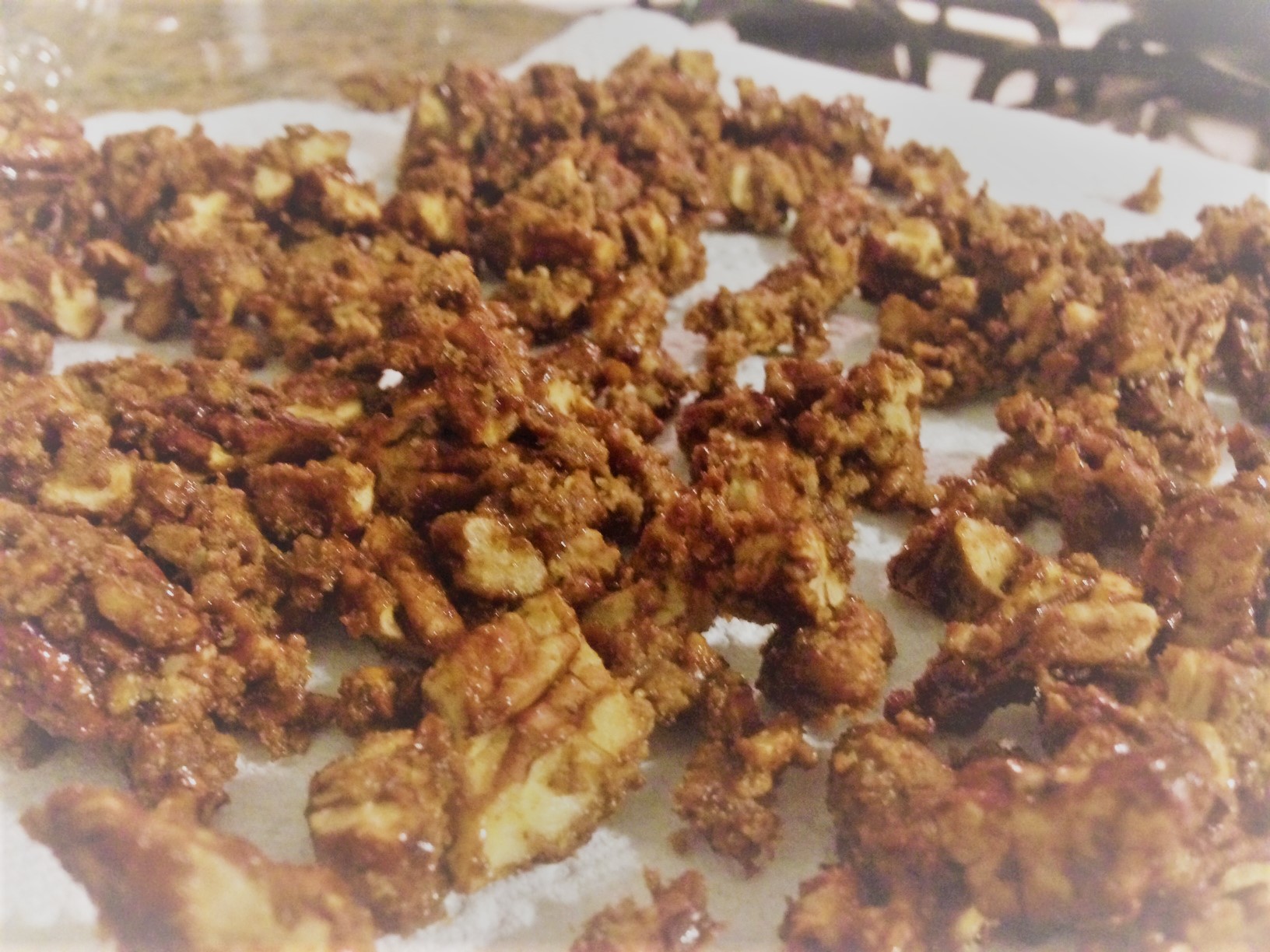 I like to eat mine with candied walnuts or candied pecans. So easy to make! Take ¼ cup sugar (combo of white and brown, as you like), one cup of chopped nuts, and 1 tsp of pumpkin pie spice and a pinch of salt—combine all in a pot and heat over medium-high heat on the stove, stirring constantly until the sugar melts and coats the nuts. Then spread over a paper towel to cool and dry. (If you leave them too long in the pot untended they will turn to rock crystals in the kettle, hell to remove.)