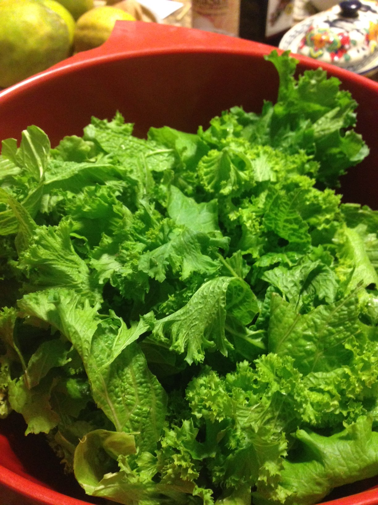 Combine all the washed and spun and ripped leaves together in a large bowl. In a separate bowl, combine the lime and dijon and whisk, then add the oil slowly while whisking, then blend in the herbs, salt and pepper. Toss the greens with the dressing and enjoy!