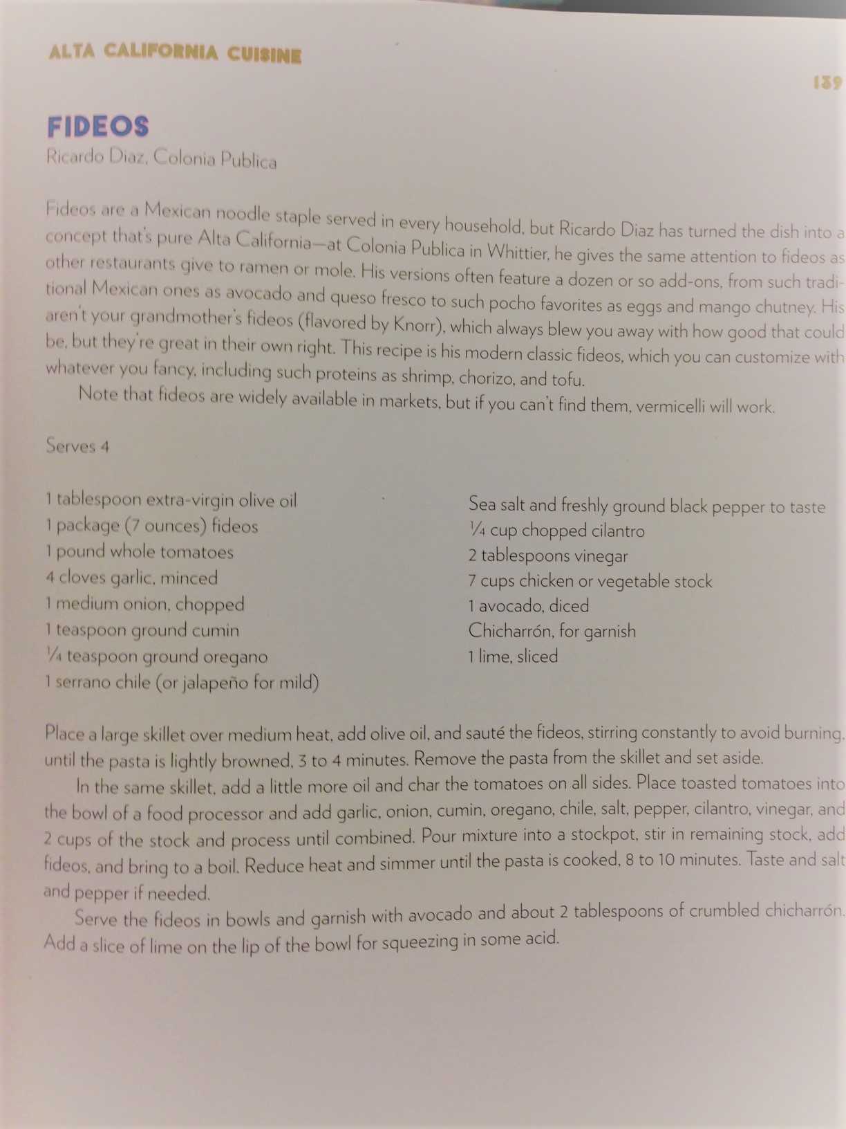 I have been inspired by this trip and the Mexican 75s (a strangely pleasing combination of tequila, lime juice and champagne) to return to the cookbook L.A. Mexicano by Bill Esparza. You should definitely try this recipe for Fideos (which means noodles).