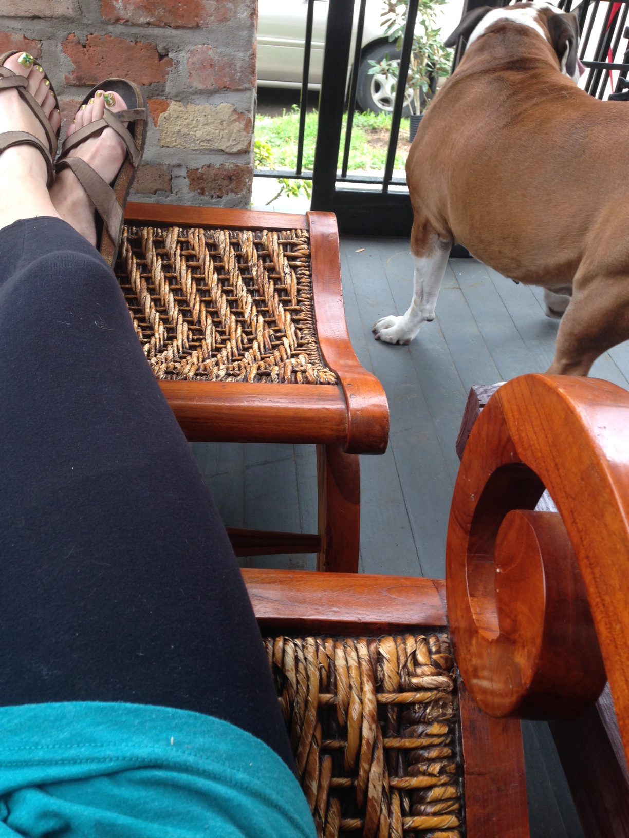 Izzy beached on sandy slats like a manatee. The view from atop a couch bluff. Porch brunch as staycation. Treat yo self.