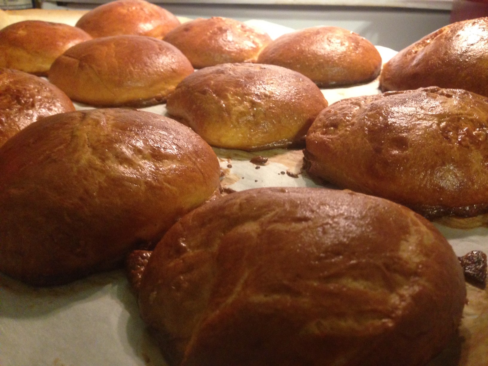 The next day, pull out and let warm on the counter for an hour. Then cut away two thirds and role into loaf pans that have been lined with parchment and buttered. With the last third, take a glass and cut out 10-12 rounds. Cover and let rise for 2-3 hours ( should double in size). Preheat the oven to 425 degrees, just before you bake, make the egg wash and coat the burger buns and loaves with wash.