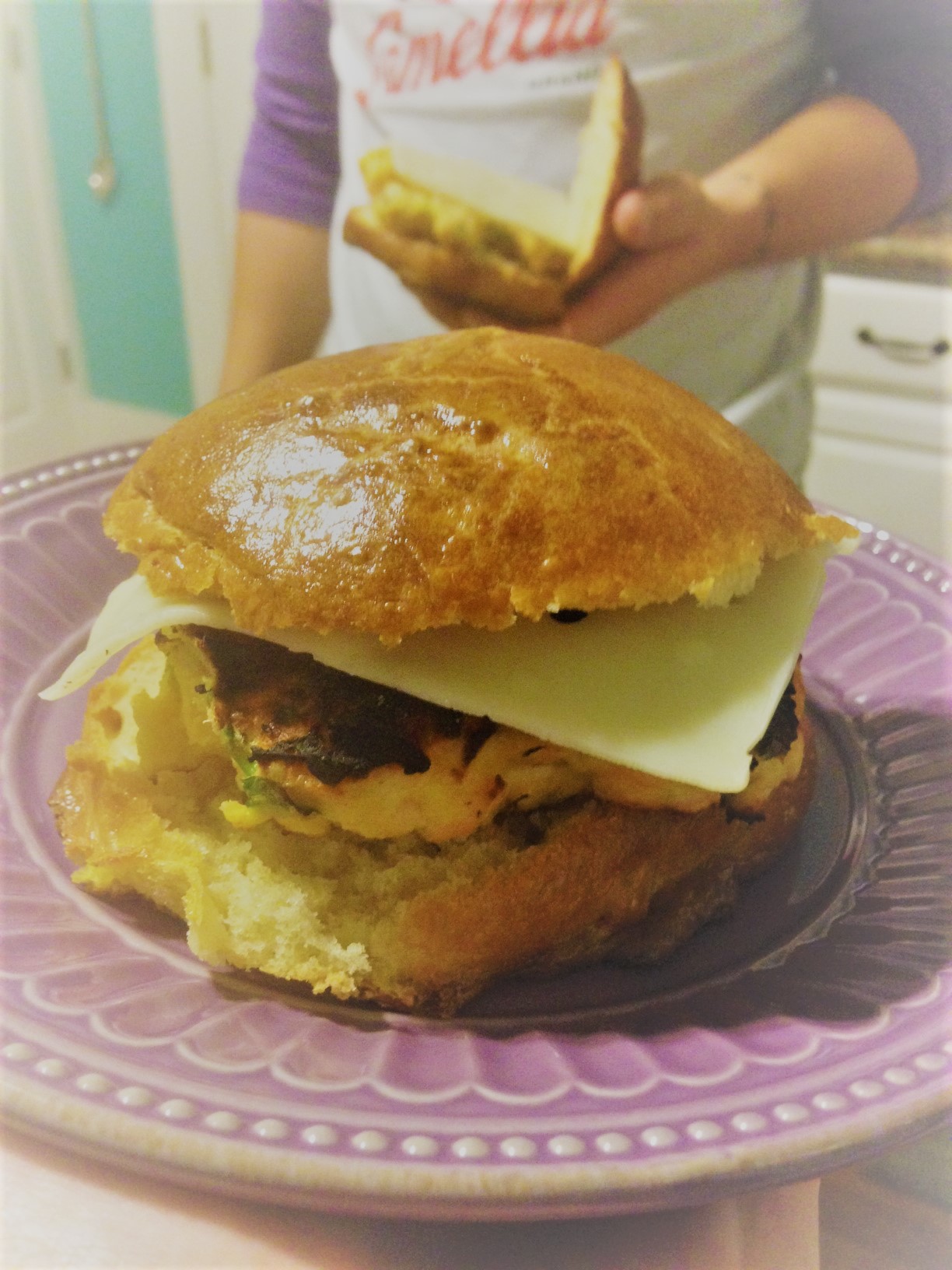 Meanwhile preheat your grill. Cook for 4-5 minutes per side. Serve on brioche buns with a slice of Jarlsberg cheese and your favorite spicy mustard.