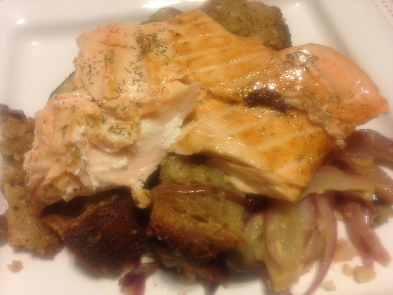 Crisp Salmon with Sesame Cumin Eggplant Panzanella