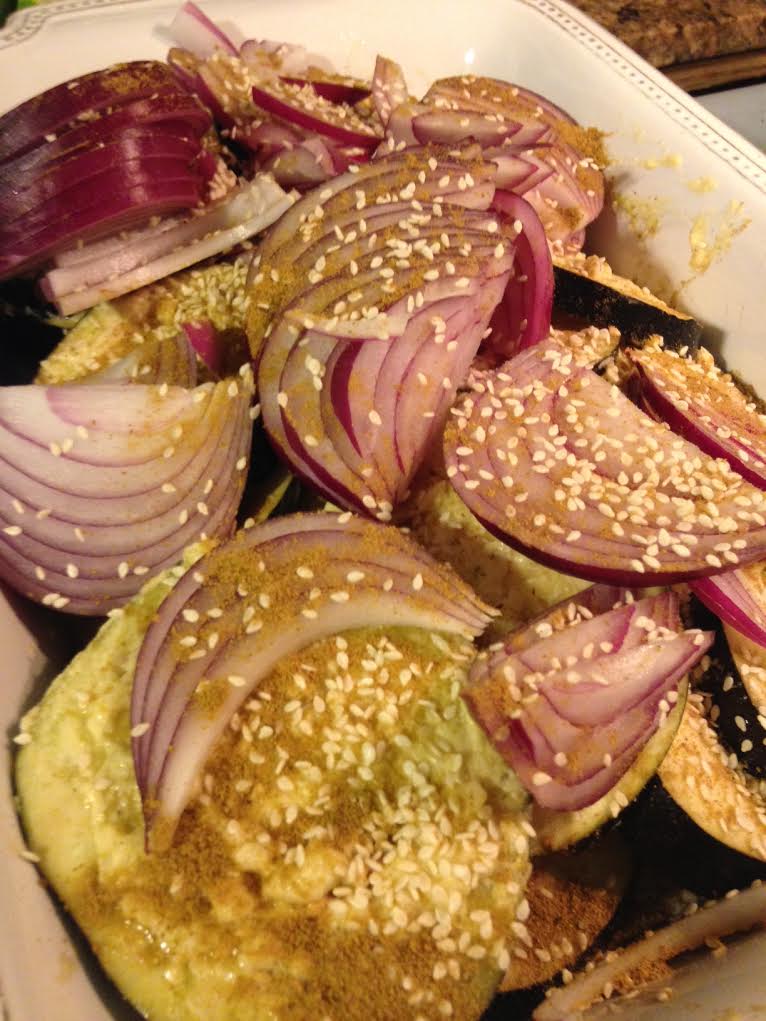 Transfer the eggplant to a rimmed baking sheet. Add all but 1/4 cup of the tahini dressing to the eggplant along with the onion, 2 teaspoons of sesame seeds and the cumin; season with salt and pepper and toss to coat. Roast the eggplant for 30 minutes, stirring occasionally.