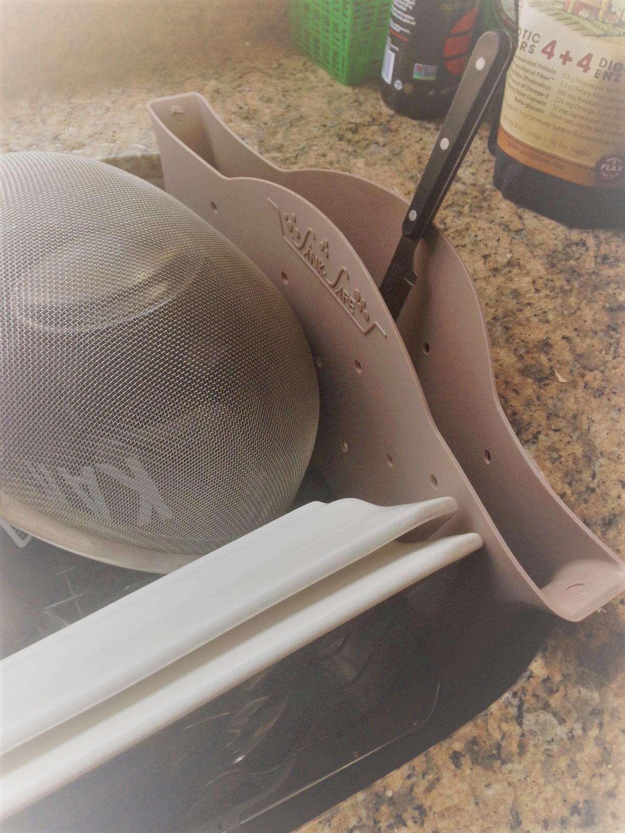 Here’s a snazzy tool for the kitchen. Ever been stabbed by your own Wusthof lurking in the bottom of the soapy dishwater? Or pricked by a knife blade standing up in the silverware tray? For those of us doing our dishes by hand (so as to meditate), Sink Safe Multi-Purpose Knife Caddy is a nice safety addition to the kitchen milieu.