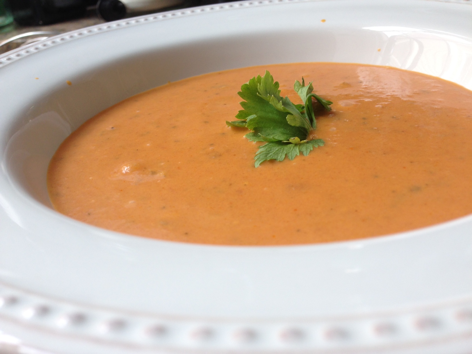 The tomatoes are ripening in the bath tub in the yard. Yellow flowers peak out from the tops of the Roma vines like springtime mistletoe and promise more and more and more. You gotta find a good bisque recipe if your yard too burgeons with ripe reds. May I offer this for the sampling.