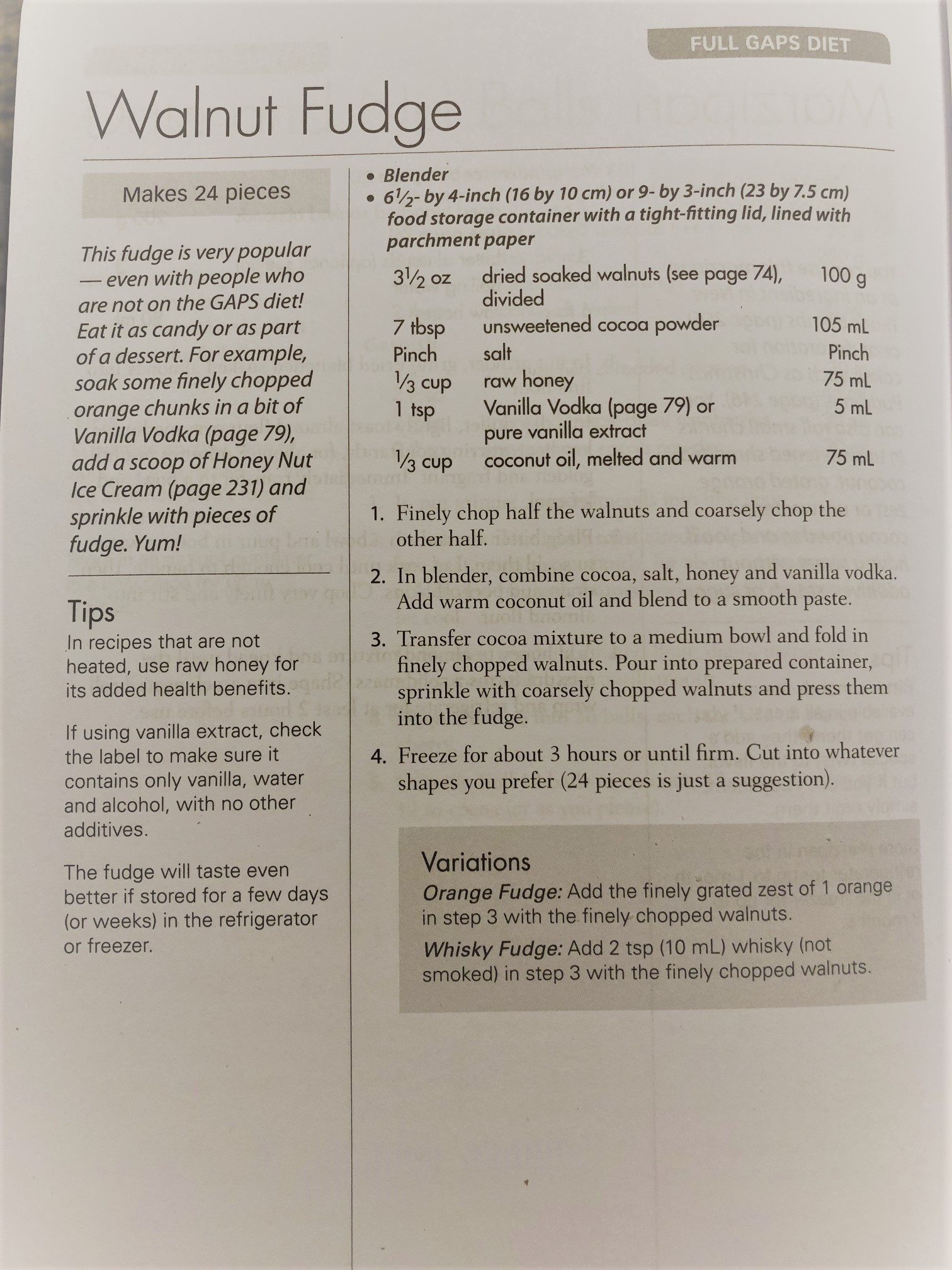 We know that there is a significant link between gut flora and mood. I look forward to learning more in this area, lots of research currently underway. For this recipe, I soaked the walnuts in salt water for half a day and then dried them out (to reduce phytic acid) which is apparently an irritant. Because I don’t have IBS or gut stuff, I didn’t notice any big change (also didn’t commit to the diet for the weeks necessary) but the fudge was awesome. Would repeat.