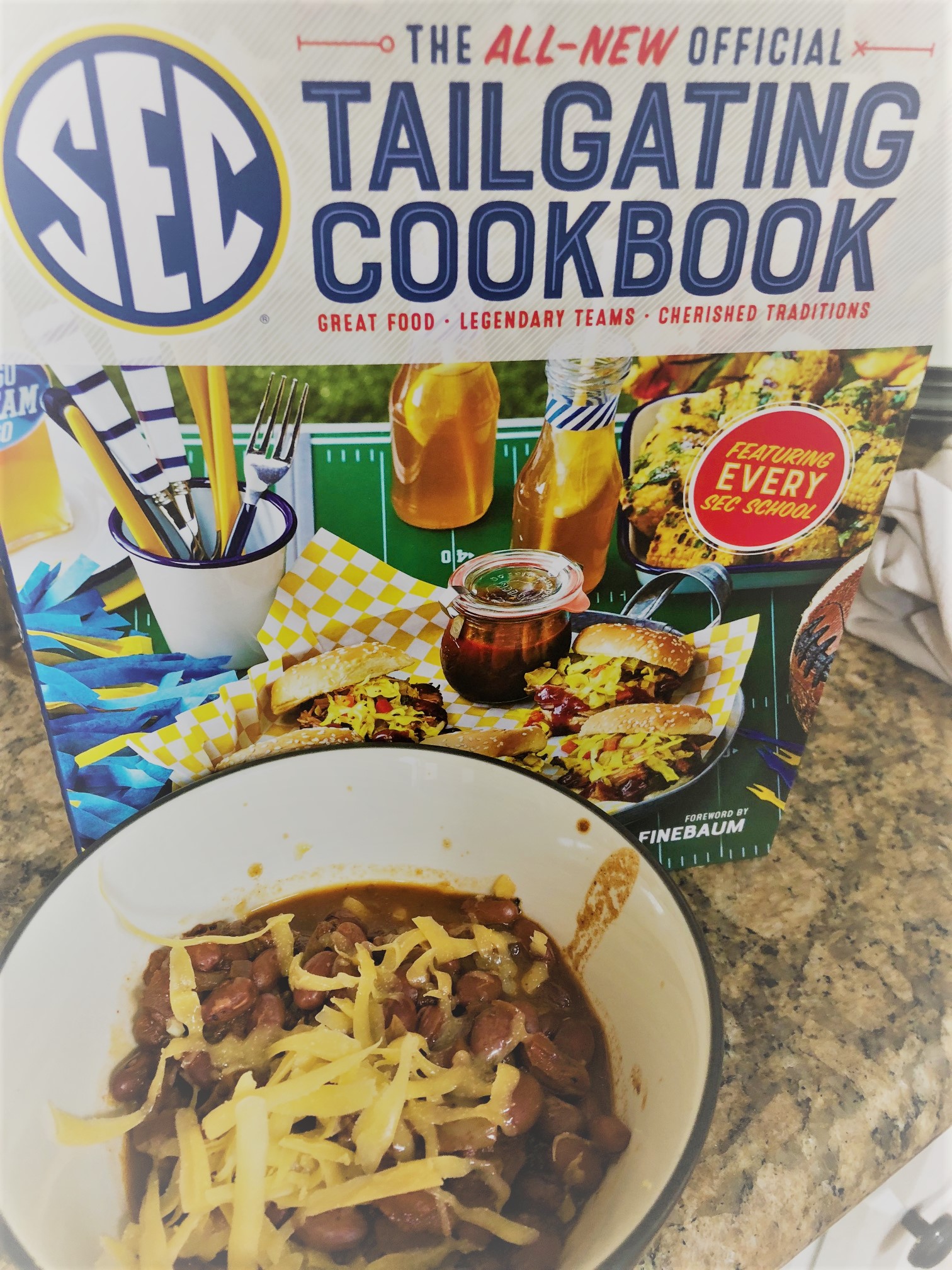 Preheat the oven to 400 degrees. Combine butter and sugar in the bowl of a stand mixer and beat until well blended, 3 min. Add eggs, one at a time. Then vanilla. Stir all the dry ingredients in a bowl separately, then add the dry to the mixer interchanged with the milk in two-three additions. Scoop a dollop of the batter onto a baking sheet lined with parchment paper. Bake at 400 until they are set and just beginning to brown, about 8 minutes. Cool the cookies on racks until totally cool. Put the filling on one side, and make a delicious whoopie pie sandwich! With the meringue filling, you can torch it to make it like a toasted marshmallow. We dipped ours in fondue chocolate left over from our chocolate fountain and created a S’more-like Whoopie Pie experience. But in the SEC Cookbook, you will see how each university team has their own signature pie recipe. Also tons of recipes for different chilis and nachos.