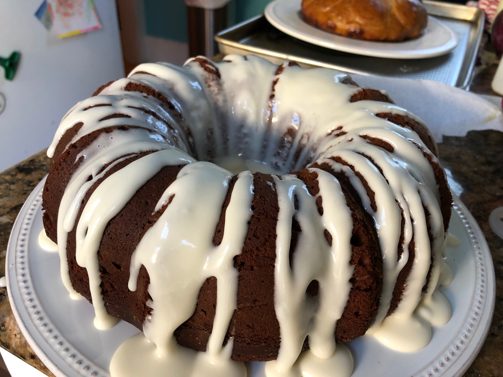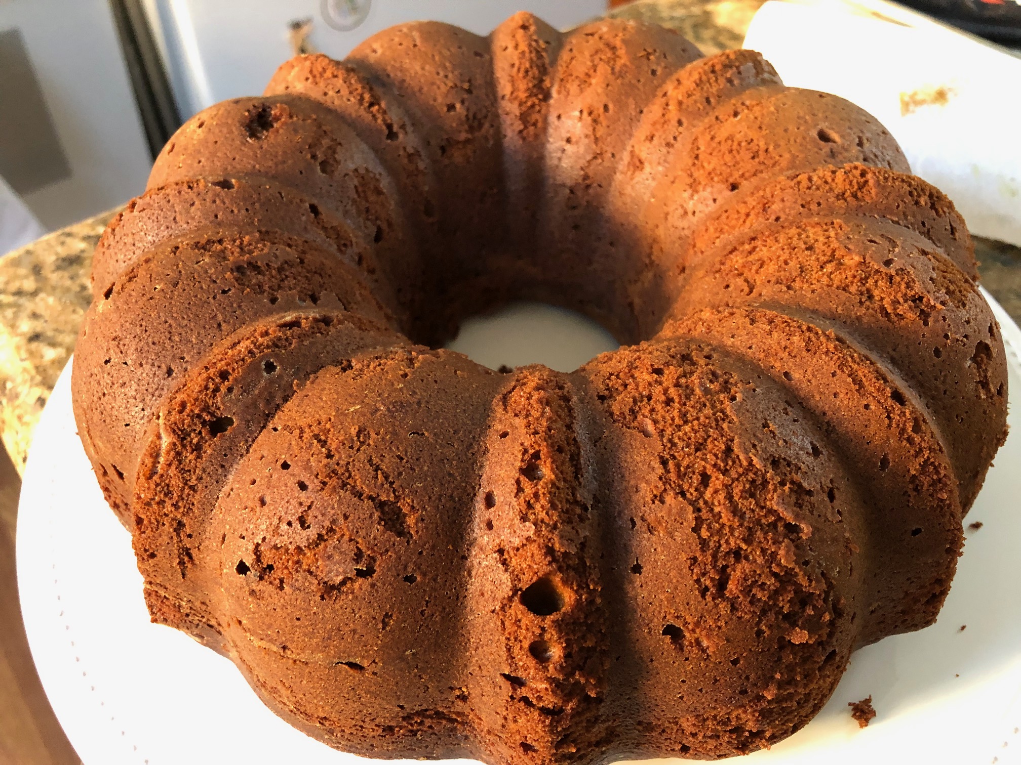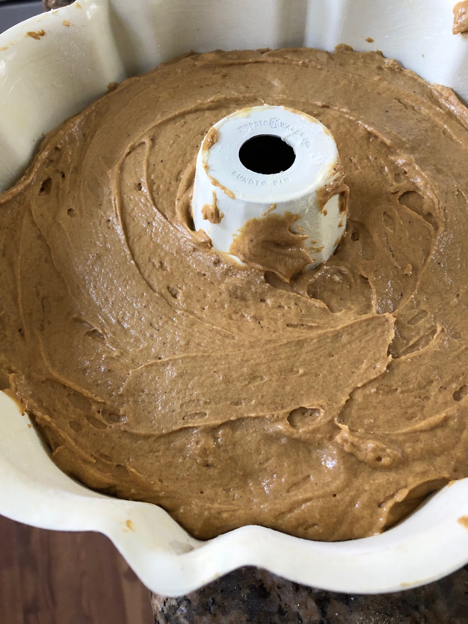 Spoon the batter evenly into the prepared Bundt cake pan. Bake until deep golden brown and a knife inserted in the center comes out clean, about 60 minutes. Set the cake on a cooling rack and let the cake cool in the pan for 10 minutes, then carefully invert onto the prepared cooling rack and let cool to room temperature before glazing.