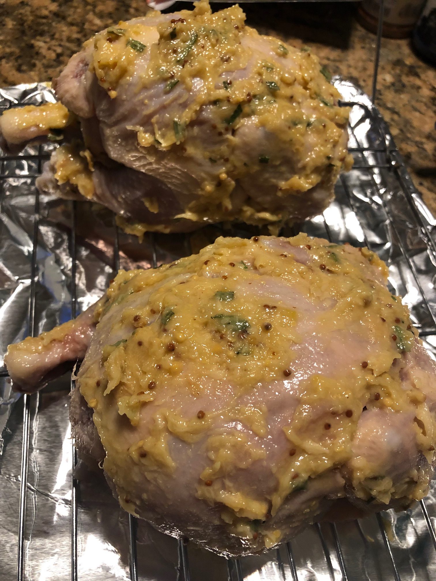 Remove chicken from brine. Discard brine. Pat chicken dry with paper towels. Spread garlic rub evenly over chicken breasts and legs. Place chicken on a wire rack set inside a rimmed baking sheet, and chill, uncovered, at least 4 hours and up to 12 hours.